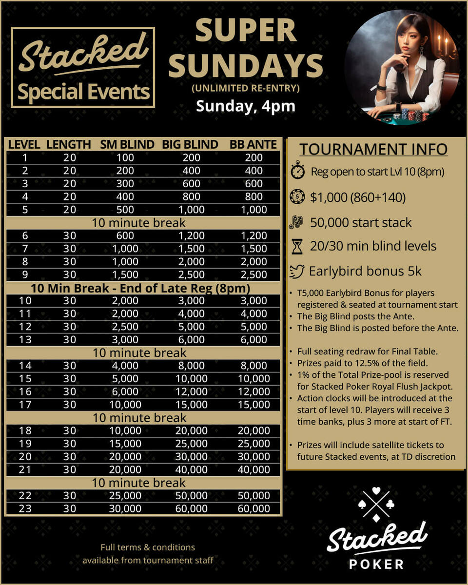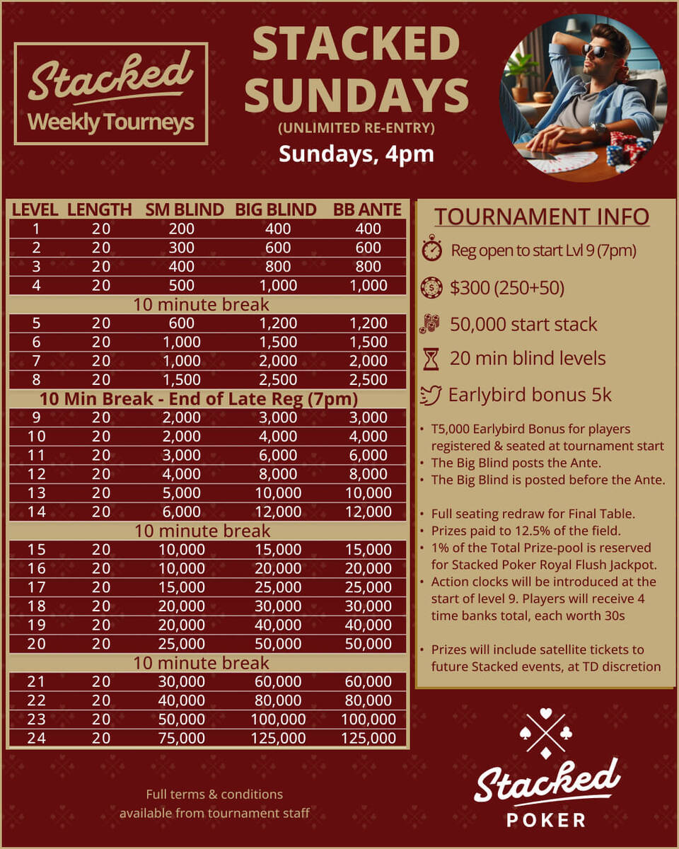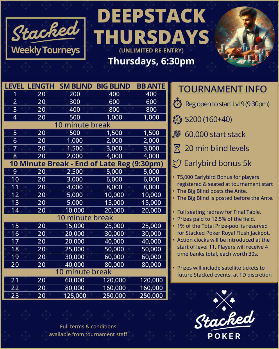 Join us for our exciting weekly stacked poker tournaments that promise not only thrilling gameplay but also incredible prize pools! Experience a lively atmosphere filled with fun, camaraderie, and plenty of action as you compete against fellow poker enthusiasts. Don’t miss out on the chance to test your skills and win big! Whether you are a seasoned player or just starting out, there’s something for everyone. Come be a part of the excitement!